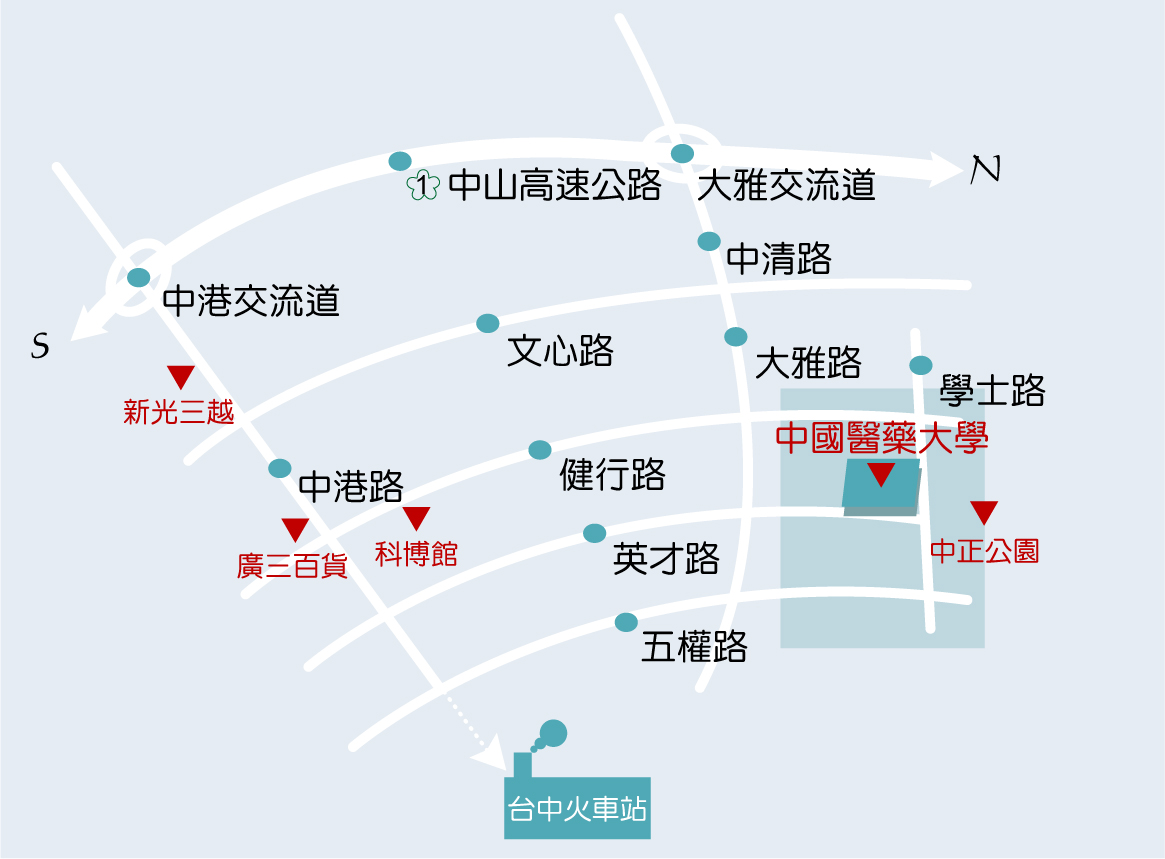 北上:由209.0K中投交流道下,經中投快速道路→五權南路→五權路左轉學士路,即可到達本校。