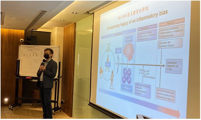 接著由中國醫藥大學附設醫院精神醫學部兒童精神科主任張倍禎醫師,進行「發炎與精神醫學:漫談憂鬱症」的演講,講述近幾年憂鬱症患者的免疫系統失調 (如發炎) 已成為研究的主流,而當給予具抗發炎作用的治療,如地中海飲食、高單位omega 3 (俗稱的魚油) 及抗發炎藥物 (如infliximab) 皆有減緩憂鬱症狀的效果。