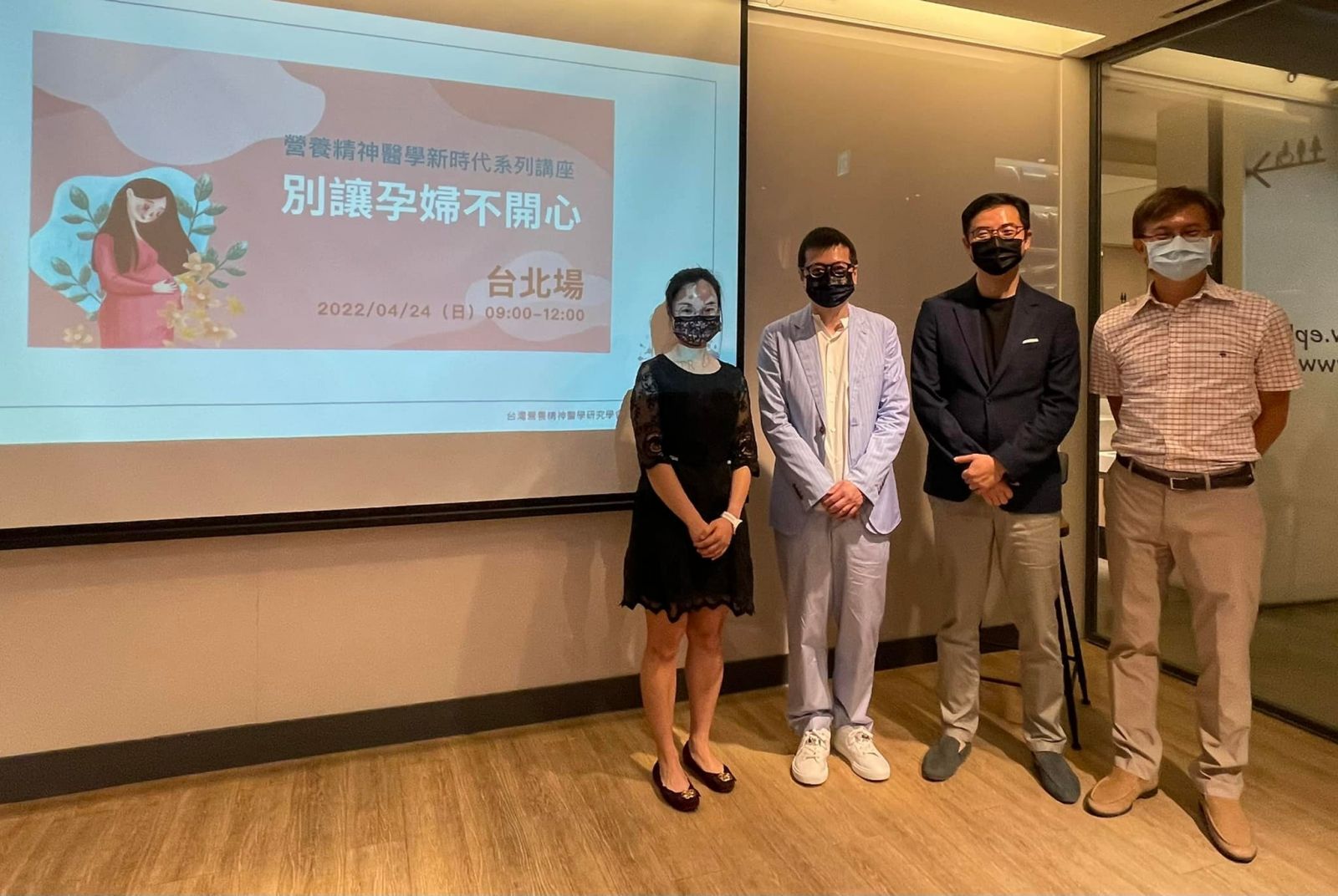 《別讓孕婦不開心》台北場之講者大合照,左起陳奐樺醫師、蘇怡寧醫師、洪敬倫醫師及蘇冠賓醫師主講。