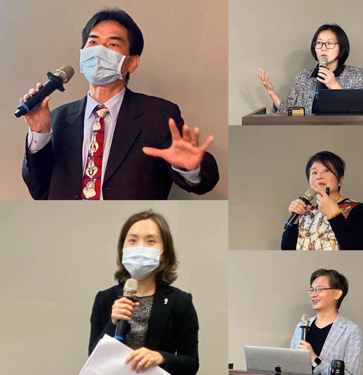 認真的主持人:邱偉哲醫師(左上)、劉惠青醫師(左下)及專業的講師王明鈺醫師(右上)、李昭慧心理師(右中)、蘇冠賓教授(右下)。