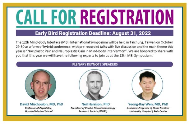 今年,國際頂尖的神經精神醫學研究團隊將聚集到台中參與這場轉譯醫學國際學術盛會。大會主題為“Nociplastic Pain and Neuroplastic Gain in Mind-Body Intervention 苦盡甘來?疼痛與身心介入治療與的愛與愁”。由Prof. David Mischoulon, Prof. Neil Harrison以及溫永銳教授擔任大會專題演講,歡迎關注疼痛醫學的相關人士與會參加,與精神醫學臨床與基礎研究的專家進行一場含金量超高的深度對話與學習! [‧‧‧‧‧]
