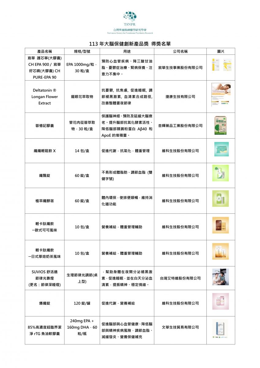 以下是113年大腦保健創新產品獎得獎名單,恭喜所有獲獎公司及產品!