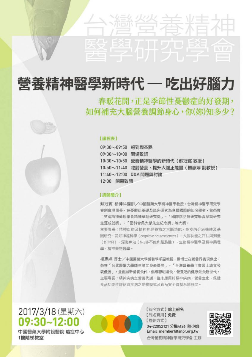3月18日(六)將請到TSNPR學會理事長─蘇冠賓 教授以及中國醫大營養系 楊惠婷副教授,教導如何「吃對營養,提升大腦正能量」。敬請把握難得一見的機會!