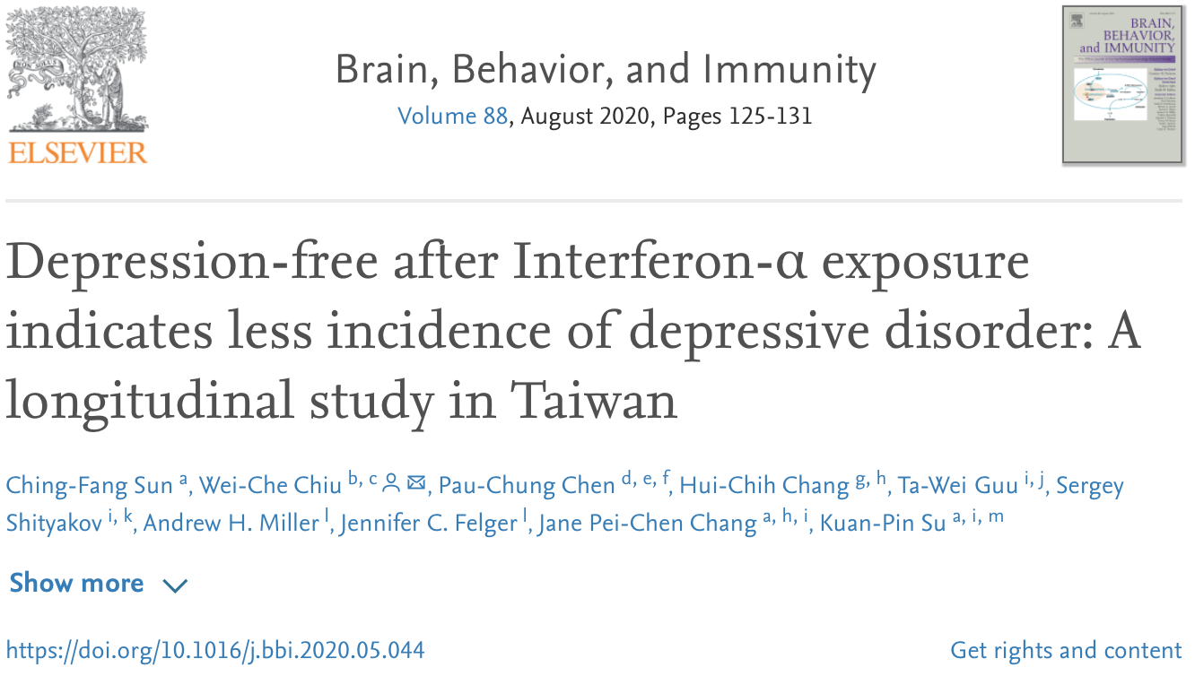 憂鬱症「預防針」?A Vaccine for Depression? 孫慶芳醫師在就讀醫學系期間在身心介面究中心(MBI-Lab)主任蘇冠賓教授指導之下,與台北國泰醫院精神科主任邱偉哲醫師合作,分析台灣健保資料庫中七萬多位C型肝炎病患 [‧‧‧‧‧]