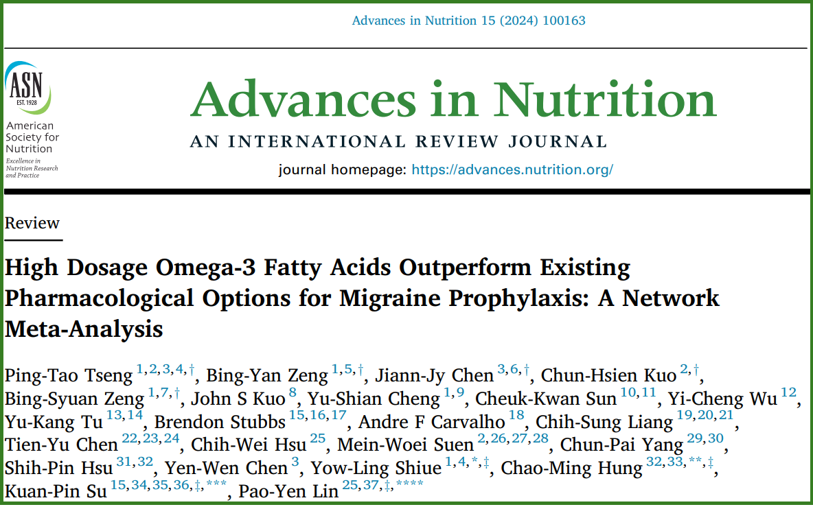原文出處:Ping-Tao Tseng, Bing-Yan Zeng, Jiann-Jy Chen, Chun-Hsien Kuo, Bing-Syuan Zeng, John S Kuo, Yu-Shian Cheng, Cheuk-Kwan Sun, Yi-Cheng Wu, Yu-Kang Tu, Brendon Stubbs, Andre F Carvalho, Chih-Sung Liang, Tien-Yu Chen, Chih-Wei Hsu, Mein-Woei Suen, Chun-Pai Yang, Shih-Pin Hsu, Yen-Wen Chen, Yow-Ling Shiue, Chao-Ming Hung, Kuan-Pin Su, Pao-Yen Lin, High Dosage Omega-3 Fatty Acids Outperform Existing Pharmacological Options for Migraine Prophylaxis: A Network Meta-Analysis, Advances in Nutrition, Volume 15, Issue 2, 2024, 100163, ISSN 2161-8313, https://doi.org/10.1016/j.advnut.2023.100163.